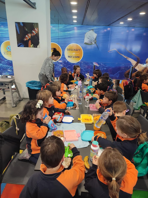 Els Esquirols i Elefants hem gaudit de la nostra primera sortida de tot el dia a l'Aquàrium de Barcelona. Hem pogut veure tots els animals marins que estem treballant dins del nostre projecte del fons marí (EI4) i els taurons i les tortugues marines (EI3). Ens ha emocionat molt poder veure tots els aquaris plens de peixos de colors, cavallets de mar, meduses lluents, pops...i el tauró ferotge. Un cop feta la visita hem pogut veure l'espectacle "N'hi ha de tots colors" que ens han preparat els monitors. Hem esmorzat, hem pogut dinat plegats i ha estat un dia molt divertit d'aventures submarines.
